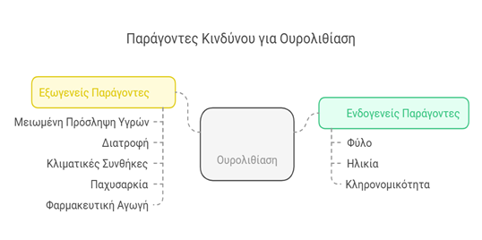 - Κλιματικές συνθήκες: Οι κάτοικοι περιοχών με θερμά κλίματα εμφανίζουν συχνότερα ουρολιθίαση.